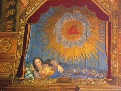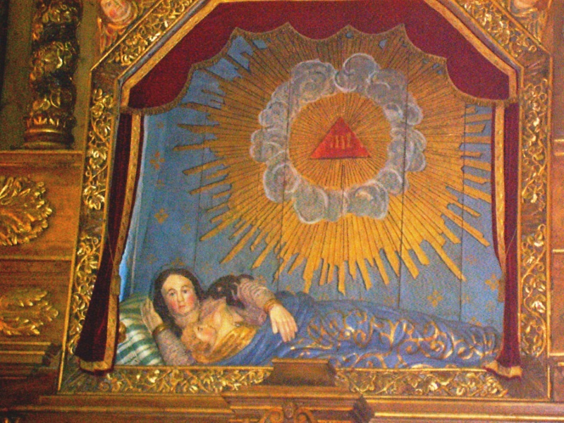 Derrière l'autel, vous pourrez admirer une Vierge couchée ou vierge allaitante reposant sur un lit à couverture bleue tissée d'or qui tient tendrement son enfant contre elle. Elle vous regarde pour l'éternité. Cette représentation de la Vierge couchée est très rare. Il n'en existe que trois autres en Bretagne.