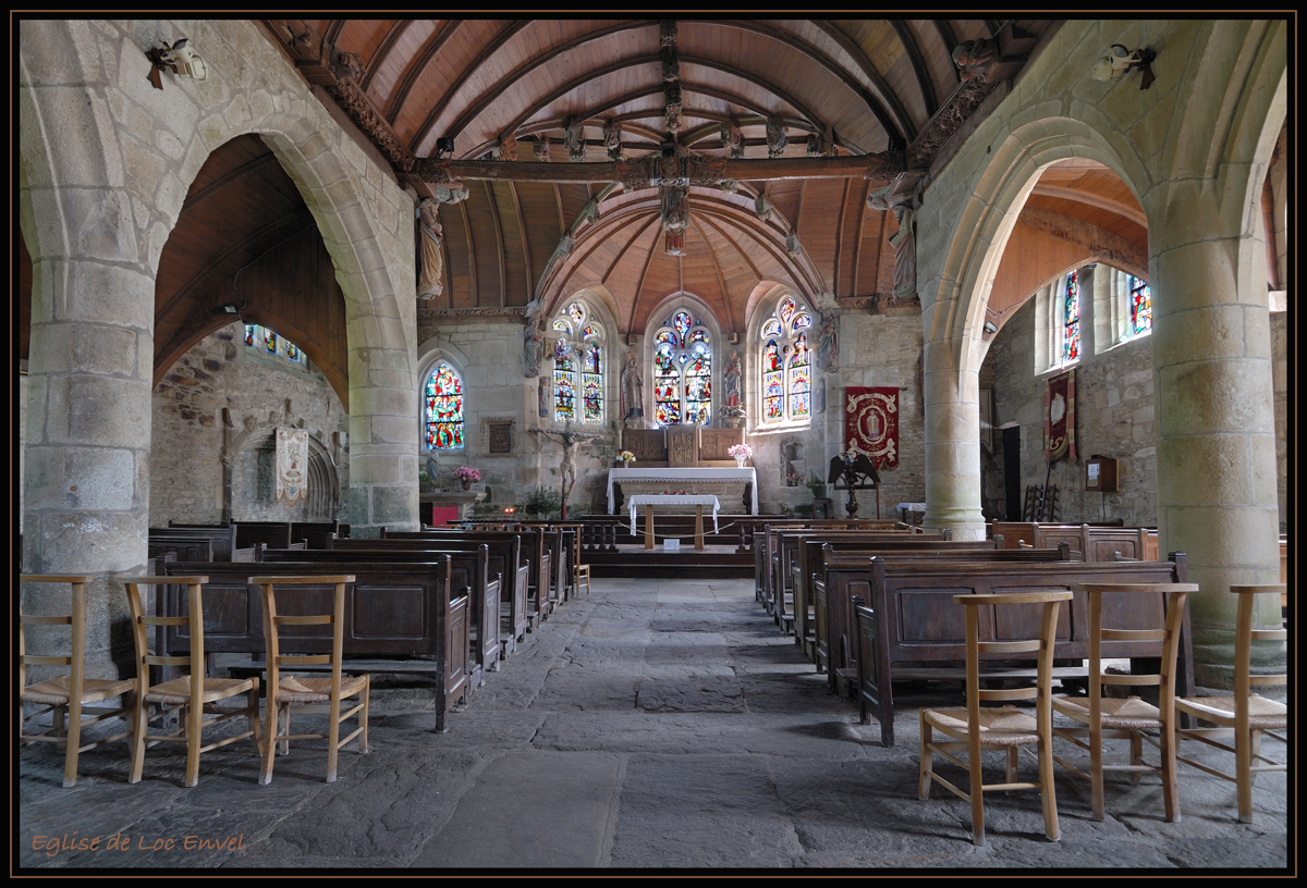 Visite de l'Eglise de Loc-Envel (XV-XVIè S) de style gothique flamboyant, construite par les moines bénédictins de St Jacut-de-la-Mer et fondée semble t-il par les seigneurs de Belle Isle. L'édifice actuel date du XVIè siècle. L'intérieur de l'église chapelle a conservé intacte sa décoration en bois sculpté. Le clocher-mur flanqué d'une tourelle et son chevet à noues multiples est l'oeuvre de l'atelier Beaumanoir de Morlaix.
